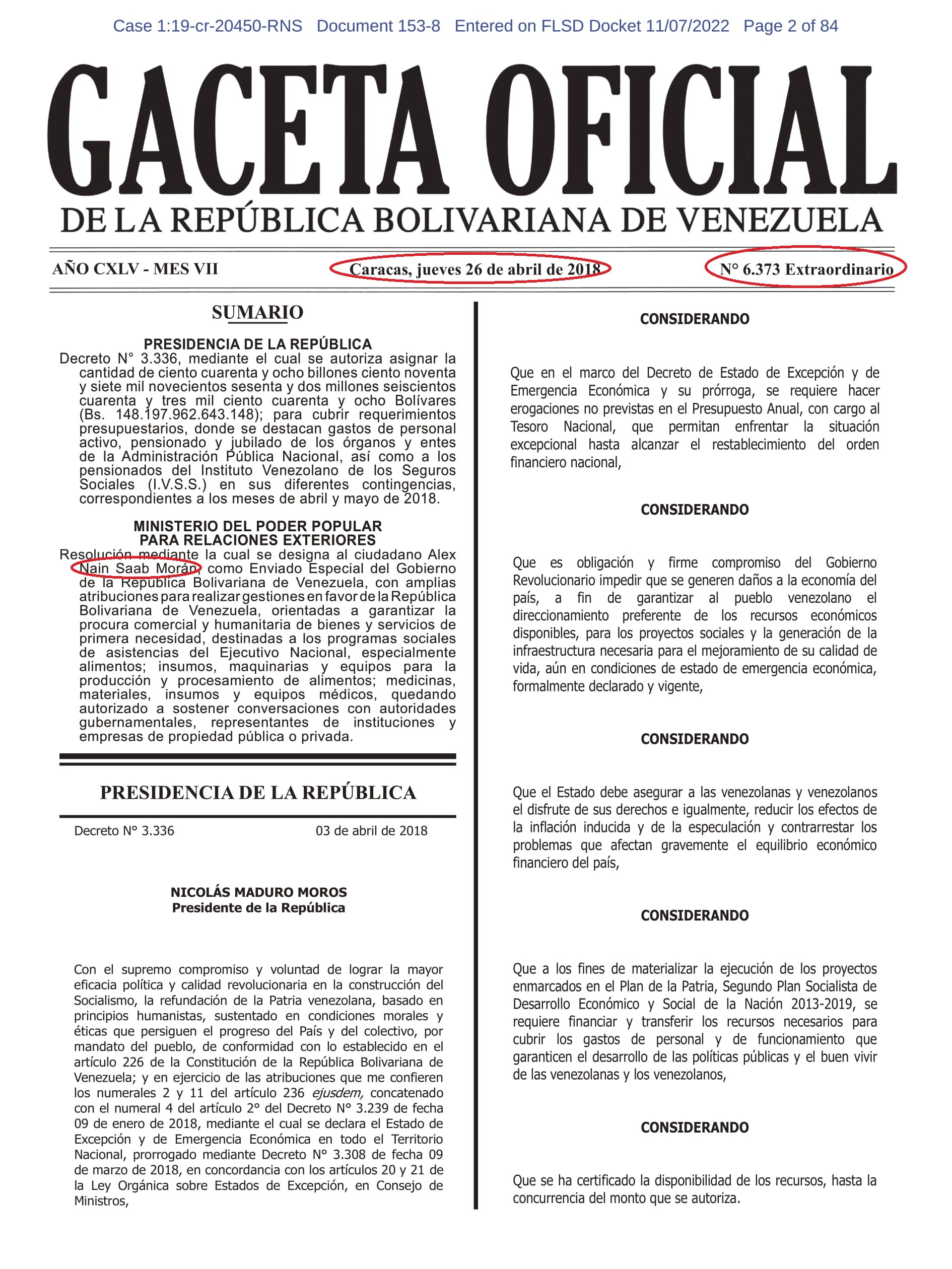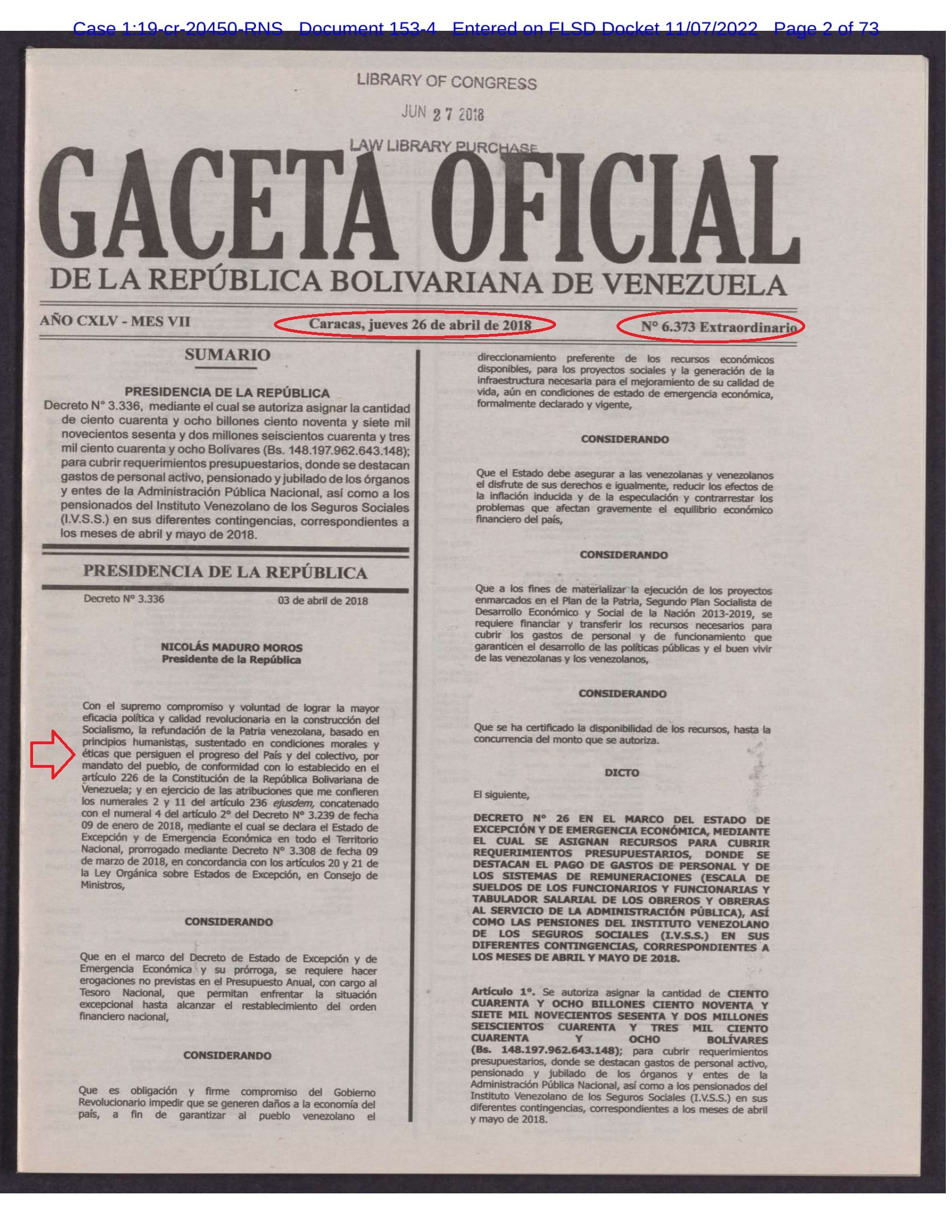 En el reporte de la Agencia AP se señala que los fiscales “obtuvieron de la Biblioteca del Congreso de Estados Unidos una copia impresa de la Gaceta Oficial de Venezuela del 26 de abril de 2018, que contradice una versión electrónica de la misma edición especial -número 6.373- producida por los abogados de la defensa que supuestamente muestra que Saab había sido nombrado enviado especial por decreto presidencial”.